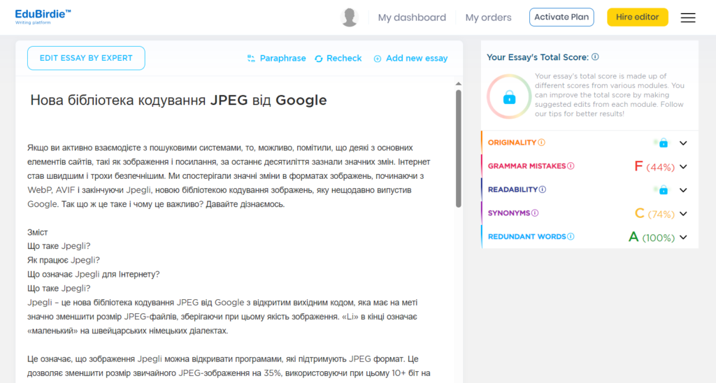 EduBirdie – це онлайн сервіс для написання есе. На базі цього сервісв є інструмент для перевірки текстового контенту на наявність плагіату і не тільки. Один з найпопулярніших серед українських спеціалістів сервіс. Під час сканування тексту інструмент одразу виявляє граматичні помилки, читабельність, оригінальність та синонімічність тексту. Єдиний мінус у тому, що у безкоштовній версії ви зможете дізнатися лише 3 з 5 показників і наявність плагіату у цей перелік не входить. Тому, якщо оберете для себе саме цей ресурс, майте на увазі, що потрібно буде обовязково придбати підписку на Premium акаунт.