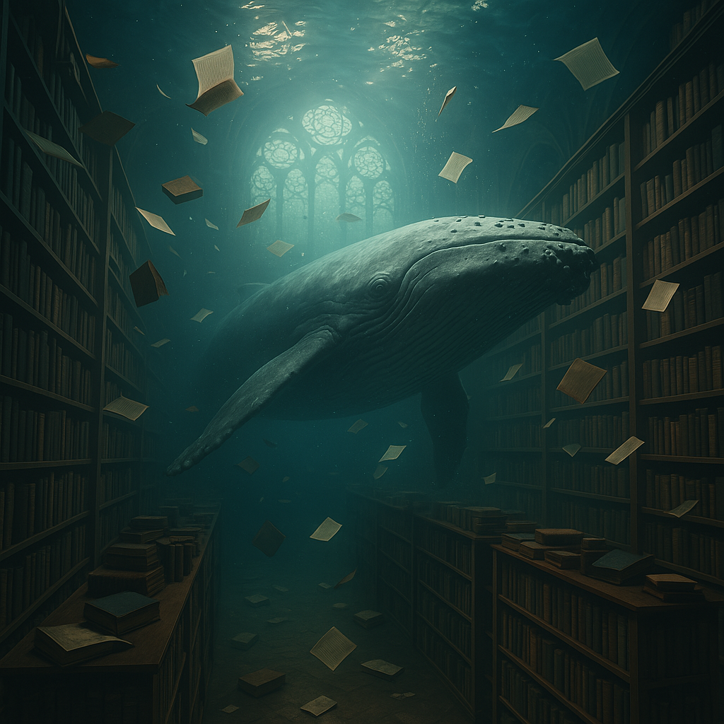 Далі один з тих експериментів, де перевіряєш не просто технічну якість, а чутливість моделі до настрою й метафори. Я задала промпт на створення фотореалістичної сцени: гігантський кит пливе між книжковими стелажами затопленої бібліотеки. Всередині — розсіяне світло крізь вітражі, сторінки книжок повільно кружляють у товщі води, усе завмерло у дивному, спокійному сні.