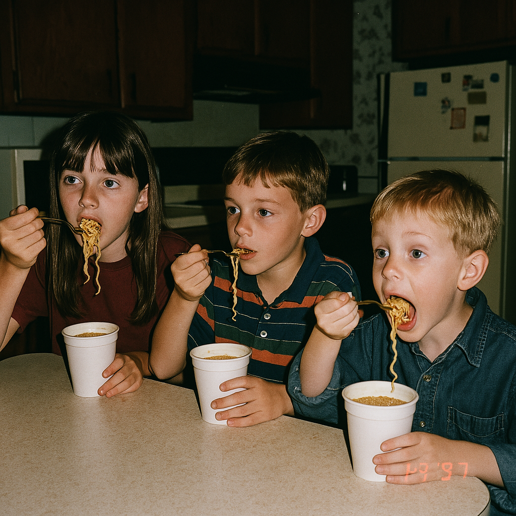 Щоб оцінити, як GPT-4o справляється зі специфічними візуальними стилями, я задала промпт на створення вінтажного знімка з 1997 року. Вказала ключові деталі: троє дітей на кухні їдять швидку локшину після школи, різке світло від спалаху, timestamp у кутку та легка зернистість — усе як на фото з домашньої плівкової камери.
