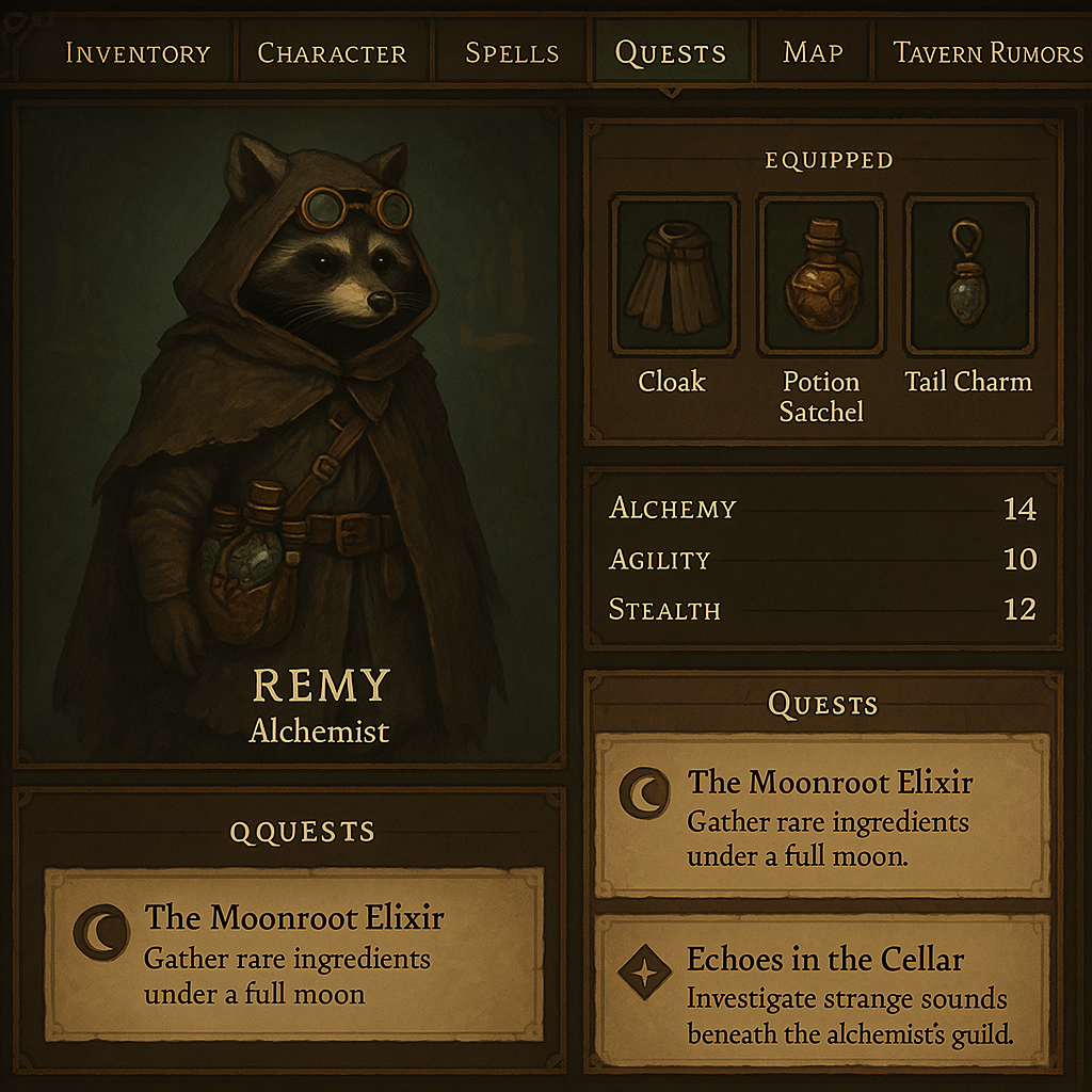 Сцена: вигаданий світ Whiskerbound Realms, де головний герой — єнот-алхімік на ім’я Ремі. На ньому — потертий плащ, окуляри та фляга із зіллям. Я попросила змоделювати внутрішнє меню гри: вкладки, спорядження, характеристики й квести. Результат — повноцінний інтерфейс RPG-гри з деталями на рівні: “Potion Satchel”, “Tail Charm”, активні місії з назвами “The Moonroot Elixir” та “Echoes in the Cellar”.