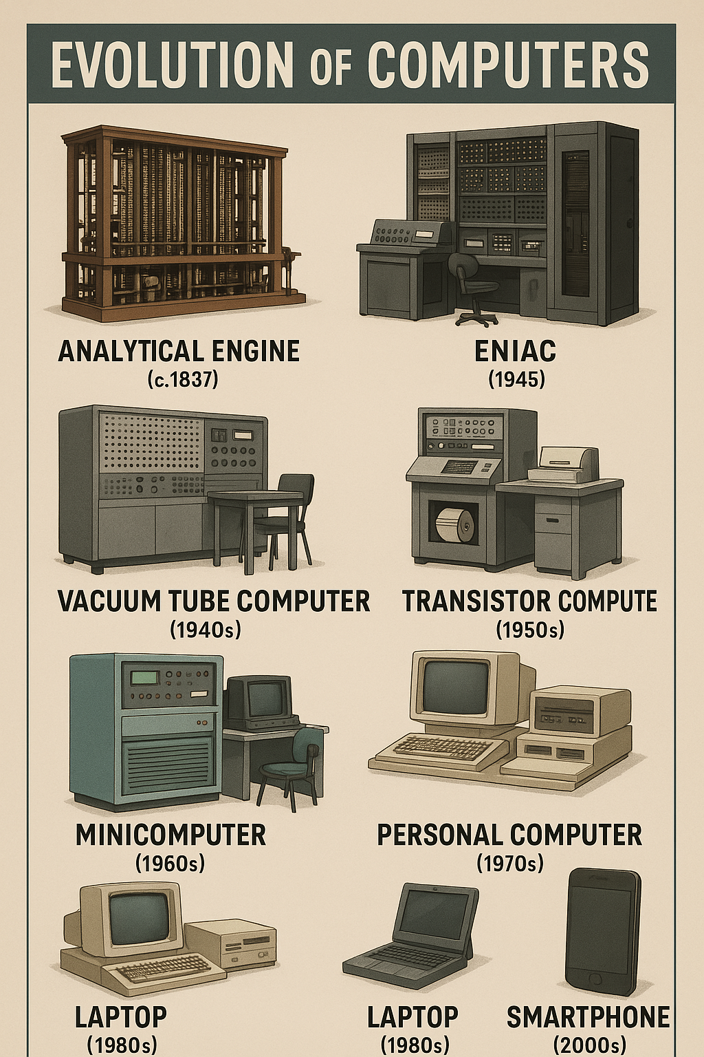 У результаті — логічна хронологія: від аналітичної машини Чарльза Беббіджа до сучасного смартфона. Кожен пристрій візуалізовано у впізнаваному стилі, без зайвих деталей, але з характерними елементами.