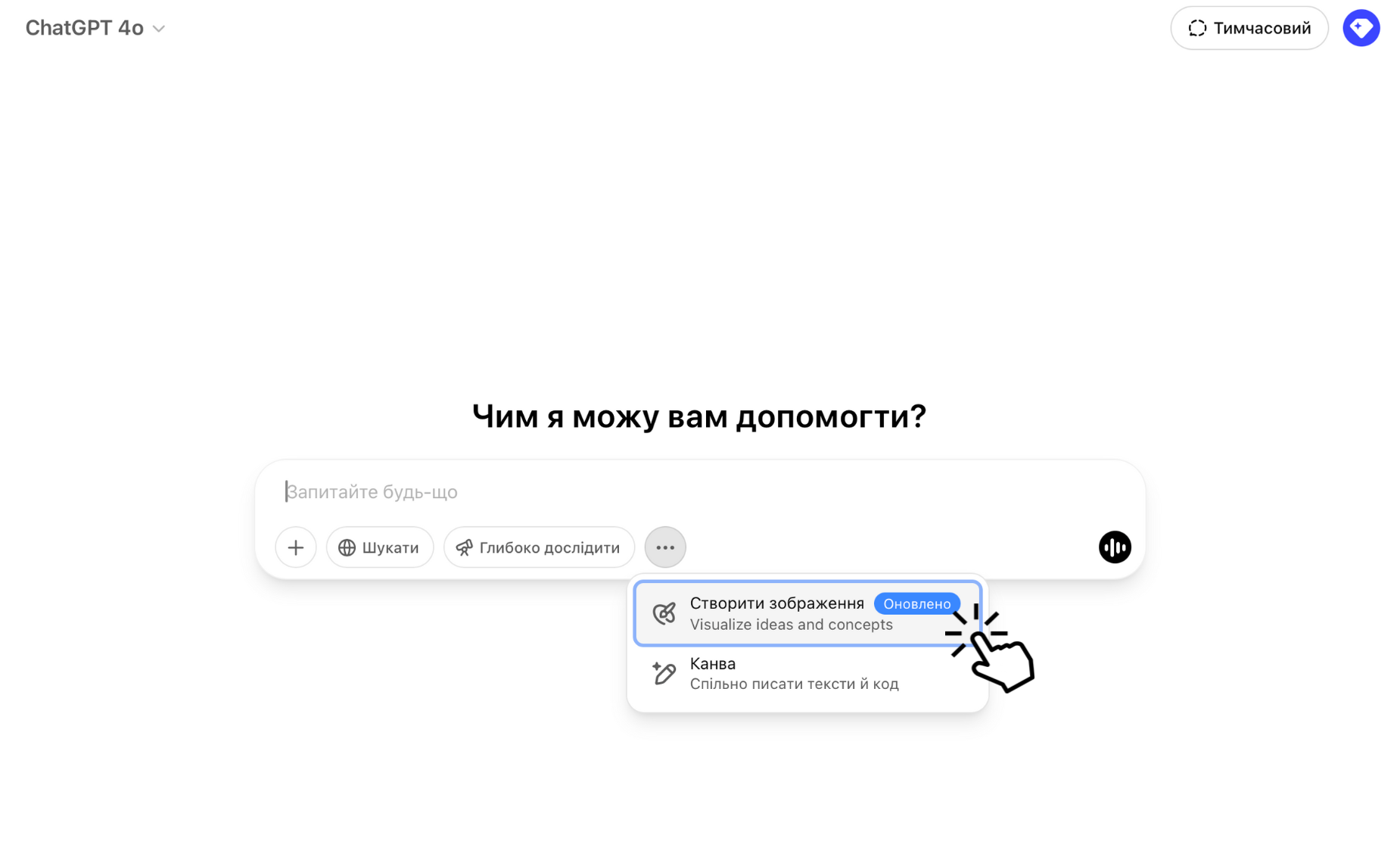 Ти можеш працювати з візуальним контентом так само просто, як ставиш звичайні запитання в ChatGPT. Все інтегровано в єдину систему: опис → уточнення → готовий результат.