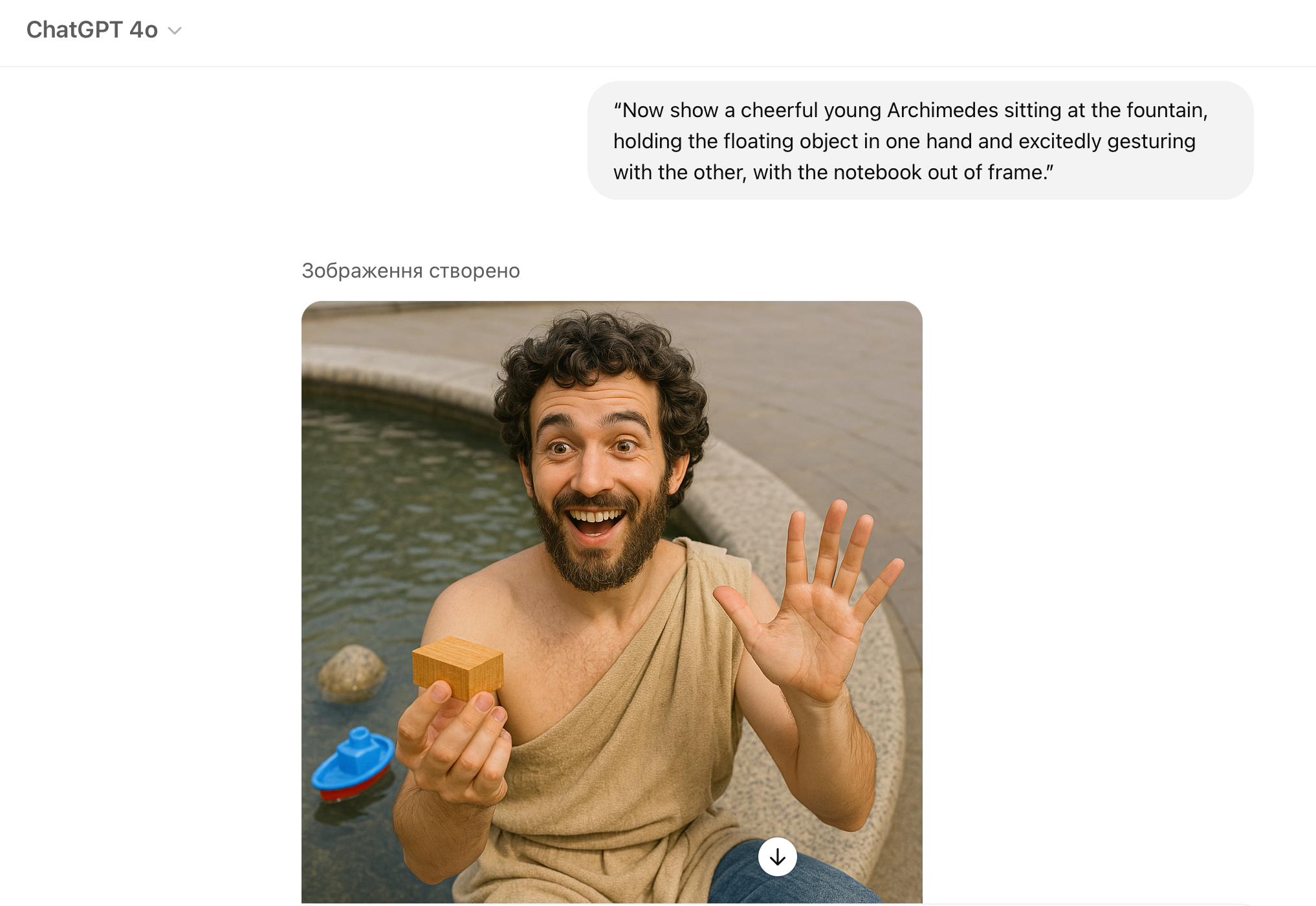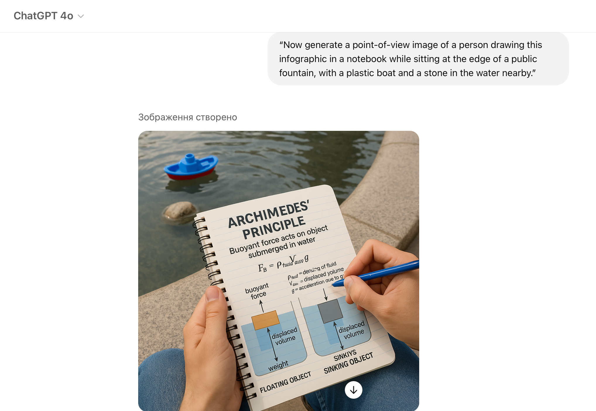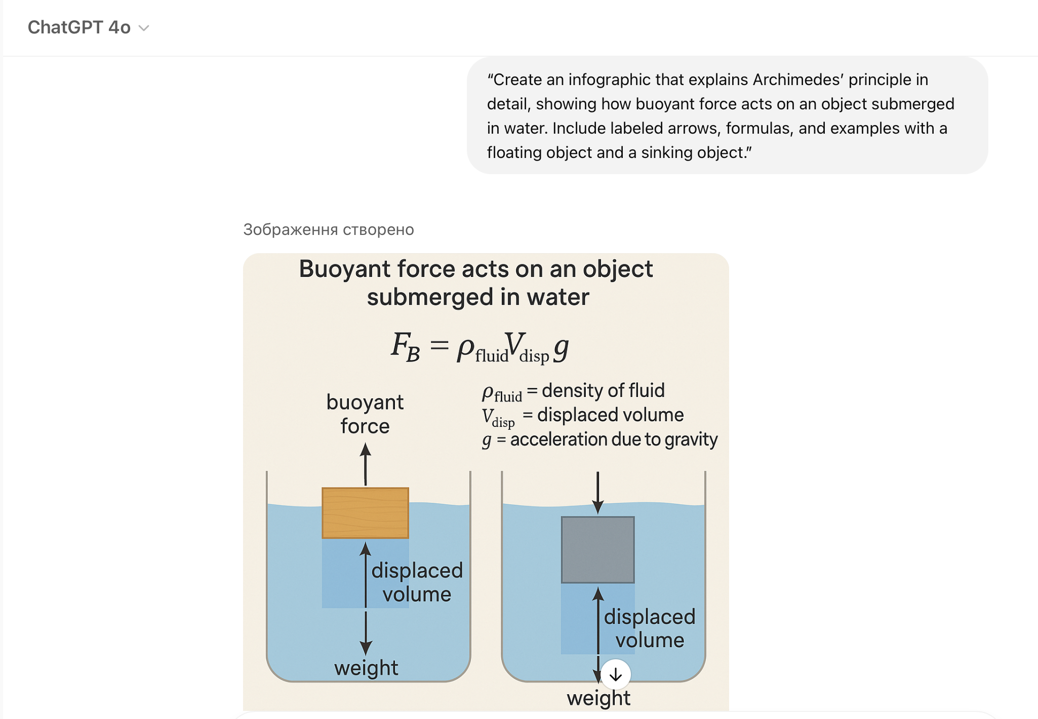 Я також протестувала, як GPT-4o справляється з навчальним контентом. Задала запит на інфографіку, що детально пояснює Закон Архімеда — як працює виштовхувальна сила.