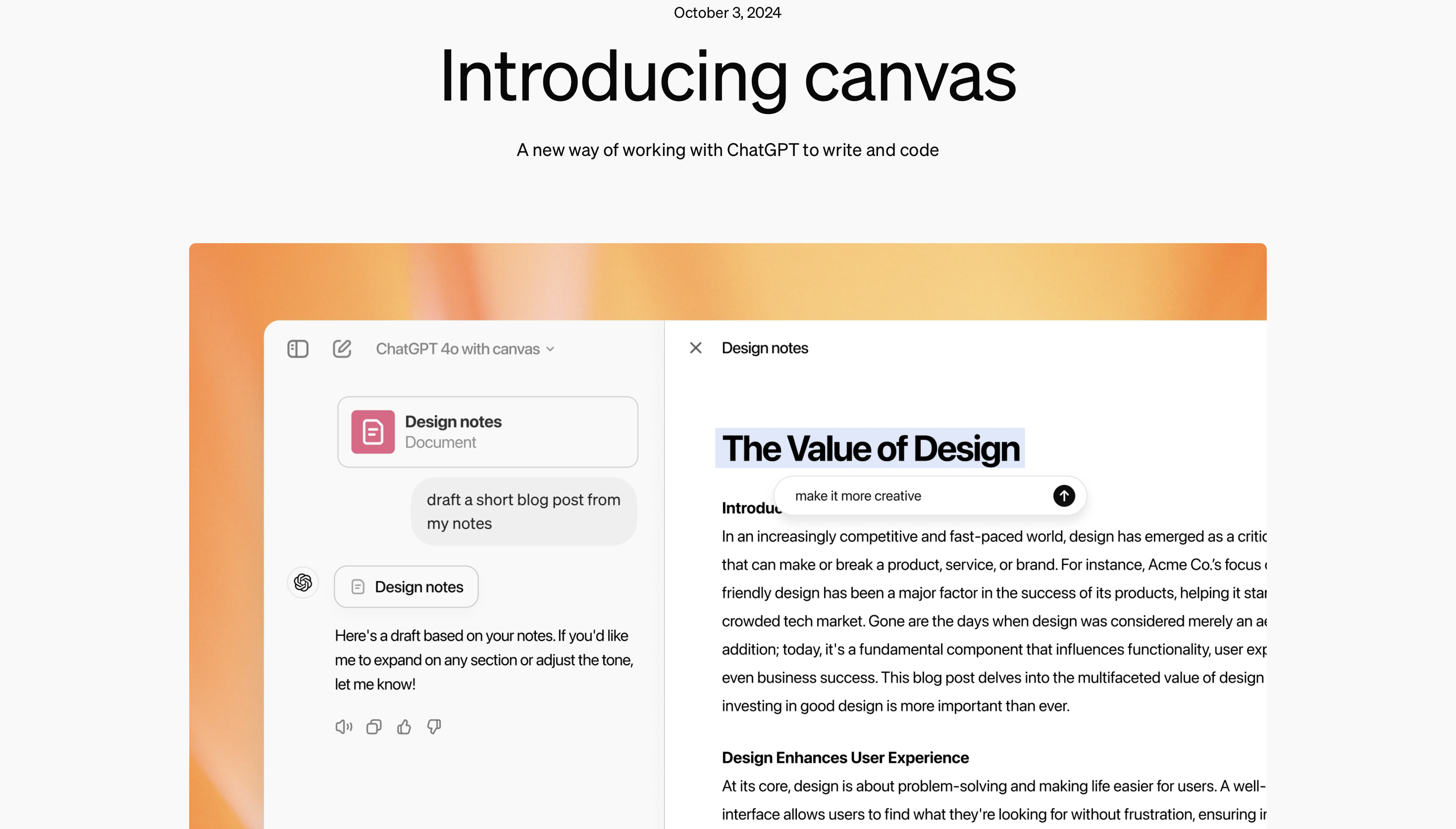 Canvas – це інтерфейс для співпраці з ChatGPT над написанням тексту та коду, що відкриває нові можливості для більш ефективної взаємодії. Цей інструмент дозволяє користувачу та ChatGPT працювати разом над проєктом, подібно до редактора або рецензента коду. Користувачі можуть виділяти певні секції тексту або коду, щоб вказати ChatGPT, на що саме звернути увагу, та отримувати зворотний зв’язок прямо у процесі роботи.