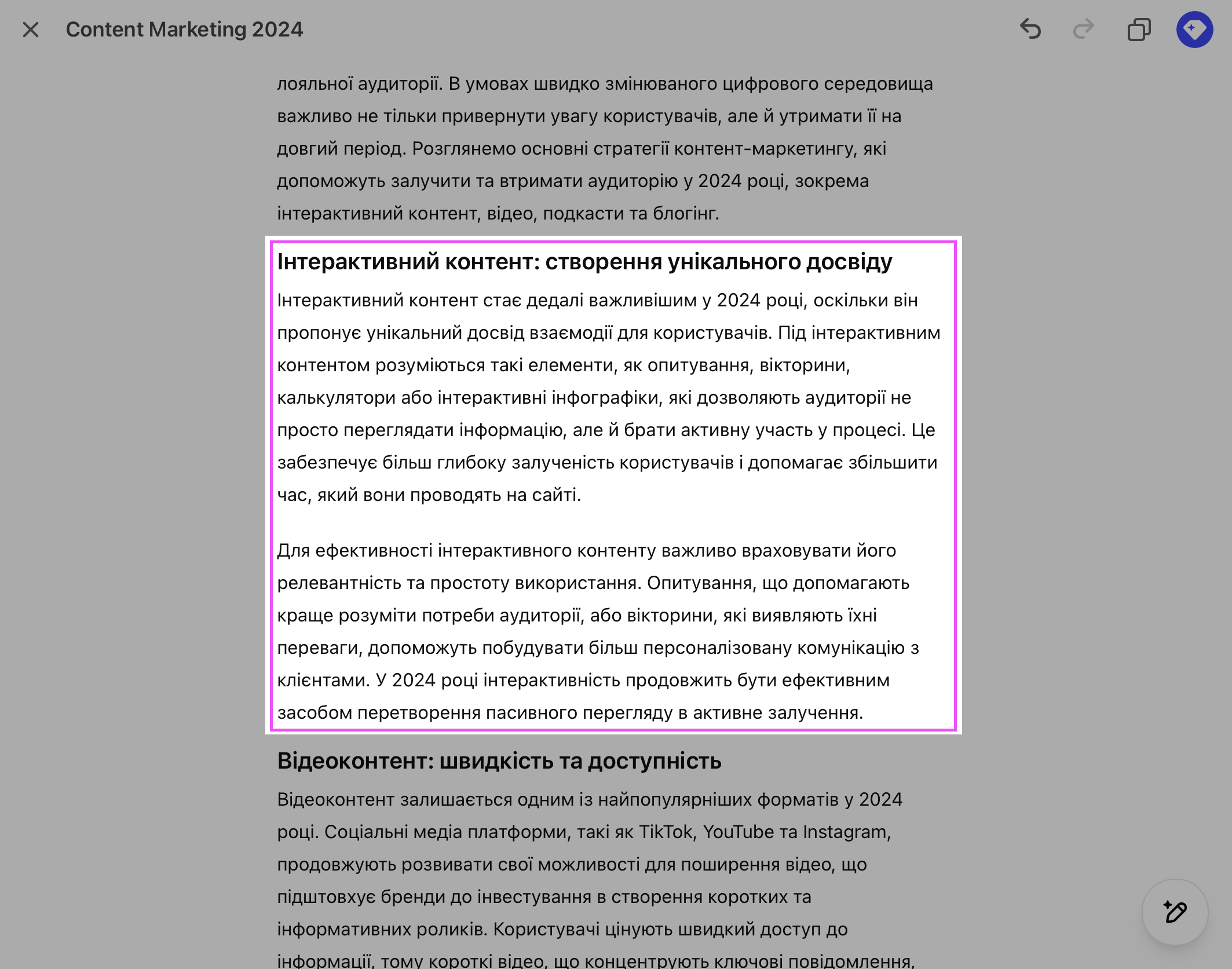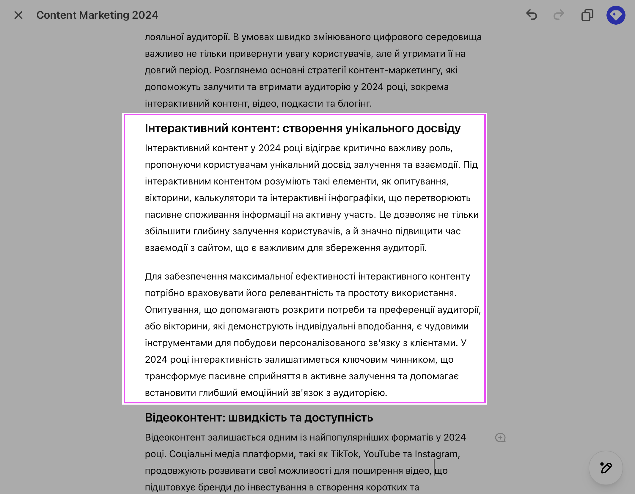 Я ввела промпт: “Створи чорновий варіант статті на тему ‘Контент-маркетинг 2024: Як створювати контент, який приваблює та утримує аудиторію’. Включи опис інтерактивного контенту, відео, подкастів і блогінгу як ключових стратегій для маркетингу у 2024 році.”
